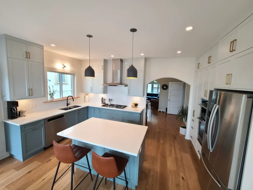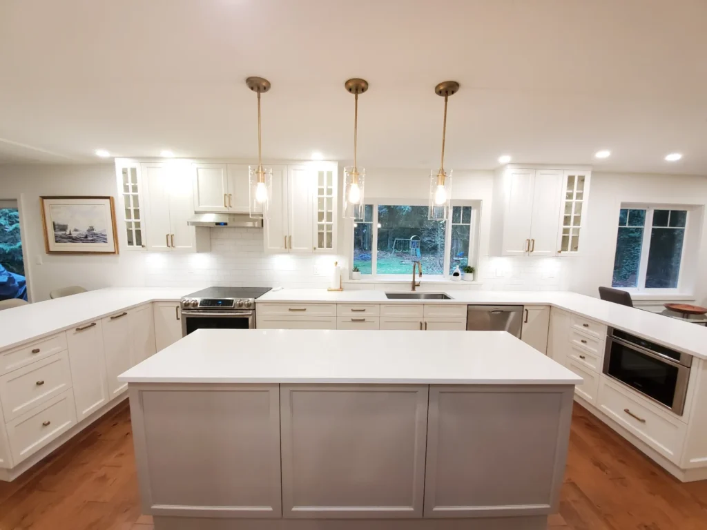Our design process eliminates guesswork through detailed 3D renderings that show your exact space with your chosen finishes. You’ll see how natural light affects cabinet colors, understand traffic flow around islands, and spot potential issues before construction begins.